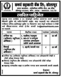 ऑफलाईन अर्ज करण्याचा पत्ता- समर्थ सहकारी बँक लिमिटेड सोलापूर, प्रधान कार्यालय, अंत्रोळीकर शॉपिंग सेंटर, वृत्त चौक, सोलापूर – 413001