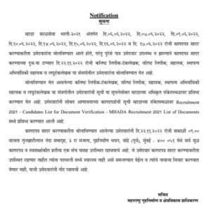 म्हाडा सरळसेवा भरती २०२१ अंतर्गत दि.०६.०६.२०२२, दि.०७.०६.२०२२, दि.०९.०६.२०२२, दि.१०.०६.२०२२, दि.१४.०६.२०२२, दि.१५.०६.२०२२, दि.१६.०६.२०२२ व दि. १७.०६.२०२२ रोजी कागदपत्र सादर करण्याकरीता उमेदवारांना बोलविण्यात आले होते, परंतु पुरेसे पात्र उमेदवार उपलब्ध न झाल्याने कागदपत्र सादर करण्याच्या दुस-या टप्प्यात दि. २२.११.२०२२ रोजी कनिष्ठ लिपीक-टंकलेखक, वरिष्ठ लिपीक, सहायक, स्थापत्य अभियांत्रिकी सहायक व लघुटंकलेखक या संवर्गातील उमेदवारांना बोलाविण्यात येत आहे.