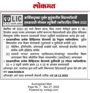 शैक्षणिक वर्ष 2021-22 मध्ये किमान 60% किंवा तत्सम श्रेणीद्वारे इयत्ता X / XII / डिप्लोमा अथवा तत्सम अभ्यासक्रम उत्तीर्ण करणाऱ्या विद्यार्थ्यांसाठी ऑल इंडिया बेसिसवर शिष्यवृत्त्या घोषित करताना एलआयसी गोल्डन ज्युबिली स्कॉलरशिप स्किम 2022 देण्यात येत आहे. एलआयसीच्या प्रत्येक