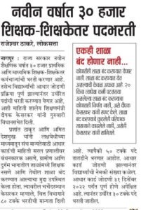 येत्या नव्या वर्षात राज्यात 30 हजार शिक्षक आणि शिक्षकेतर कर्मचाऱ्यांची भरती करण्यात येणार आहे. अर्थ खात्यानं शिक्षकांच्या 80 टक्के भरतीला मंजुरी दिली असून त्यापैकी 50 टक्के पदं तातडीनं भरण्यात येणार असल्याची घोषणा शालेय शिक्षण मंत्री दीपक केसरकर यांनी केली आहे.