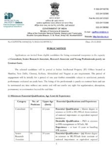 पद क्र.3: (i) M.Sc किंवा B.E/B.Tech (ii) LLB/LLM किंवा IPR पदवी/डिप्लोमा (iii) 03 वर्षे अनुभव
