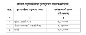 त्याचप्रमाणे अर्थसहाय्य देतांना विचारात घ्यावयाच्या मृत पशुधनाच्या संख्येवरील प्रति कुटुंब निर्बंधांचे निकष सुध्दा शिथील करून लम्पी चर्मरोग प्रादुर्भावामुळे मृत्यूमुखी पडलेल्या सर्व पशुधनाच्या मालकांना राष्ट्रीय आपत्ती निवारण धोरणातील खालील नमुद आर्थिक निकषाप्रमाणे अर्थसहाय्य देण्यात यावे.
