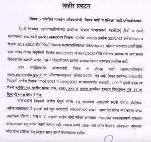Uncategorized PCMC पालिका 285 जागेच्या शिक्षक भरतीची निवड यादी प्रकाशित… By Chetan Patil On Jan 15, 2023 0 Share पिंपरी चिंचवड महानगरपालिकेने 285 पदांसाठी शिक्षक भरतीसाठी निवड व प्रतीक्षा यादी जाहीर केली आहे. 8 आणि 9 डिसेंबर 2022 रोजी मुलाखतीचे आयोजन करण्यात आले होते. 0 Share FacebookTwitterGoogle+ReddItWhatsAppPinterestEmail