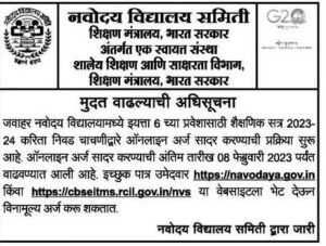 नवोदय विद्यालयासाठी प्रवेश प्रक्रियेस मुदतवाढ