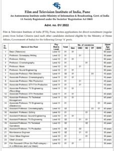 पदाचे नाव- डीन, प्राध्यापक, सहयोगी प्राध्यापक, सहायक प्राध्यापक, देखभाल अभियंता, व्हिजन मिक्सर अभियंता, मुख्य ग्रंथपाल, चित्रपट संशोधन अधिकारी