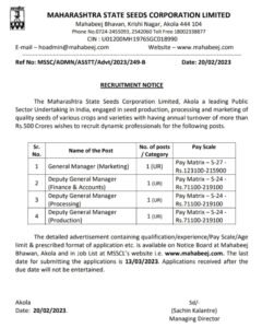 अर्ज करण्याचा पत्ता- महाव्यवस्थापक (प्रशासक), महाराष्ट्र राज्य बियाणे महामंडळ लिमिटेड, महाबीज भवन, कृषी नगर, अकोला (एमएस) 444 104