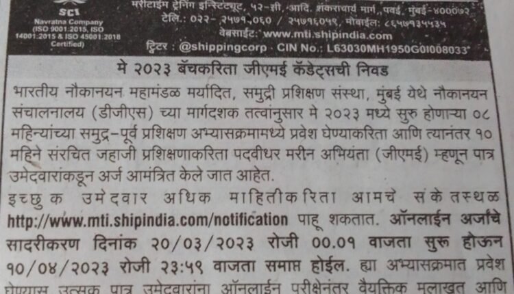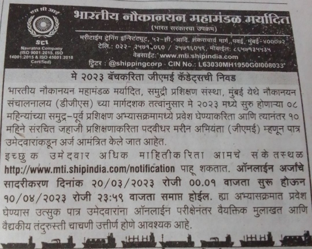 भारतीय नौकानयन महामंडळ मर्यादित, समुद्री प्रशिक्षण संस्था, मुंबई येथे नौकानयन संचालनालय (डीजीएस) च्या मार्गदशक तत्वांनुसार मे २०२३ मध्ये सुरु होणाऱ्या ०८ महिन्यांच्या समुद्र-पूर्व प्रशिक्षण अभ्यासक्रमामध्ये प्रवेश घेण्याकरिता आणि त्यानंतर १० महिने संरचित जहाजी प्रशिक्षणाकरिता पदवीधर मरीन अभियंता (जीएमई) म्हणून पात्र उमेदवारांकडून अर्ज आमंत्रित केले जात आहेत. इच्छुक उमेदवार अधिक माहितीकरिता आमचे संकेतस्थळ