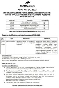 अर्ज करण्याचा पत्ता- “सहाय्यक महाव्यवस्थापक (HR-RC), महाराष्ट्र स्टेट पॉवर जनरेशन कं. लि., एस्ट्रेला बॅटरीज एक्सपेन्शन कंपाऊंड, तळमजला, लेबर कॅम्प, धारावी रोड, माटुंगा, मुंबई – 400 019 जेणेकरून 31.03.2023 रोजी किंवा त्यापूर्वी पोहोचता येईल.