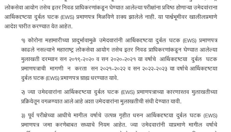 १) कोरोना महामारीच्या प्रादुर्भावामुळे उमेदवारांनी आर्थिकदृष्टया दुर्बल घटक (EWS) प्रमाणपत्र काढले नसल्याने महाराष्ट्र लोकसेवा आयोग तसेच इतर निवड प्राधिकरणांकडून घेण्यात आलेल्या मुलाखती दरम्यान सन २०१९-२०२० व सन २०२० २०२१ या वर्षाचे आर्थिकदृष्टया दुर्बल घटक प्रमाणपत्राची मागणी न करता सन २०२१-२०२२ व सन २०२२-२०२३ या वर्षाचे आर्थिकदृष्ट्या दुर्बल घटक (EWS) प्रमाणपत्र ग्राह्य धरण्यात यावे.