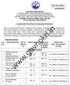 पदाचे नाव- अतिरिक्त महाव्यवस्थापक (नौदल आर्किटेक्चर), अतिरिक्त महाव्यवस्थापक (एचआर), उपमहाव्यवस्थापक (वित्त), वरिष्ठ व्यवस्थापक (शिपलिफ्ट आणि जहाज चालक), वरिष्ठ व्यवस्थापक (प्रशासन), उपव्यवस्थापक (वित्त), वरिष्ठ व्यवस्थापक ( शस्त्रे आणि सेन्सर्स), वरिष्ठ व्यवस्थापक (प्रकल्प), व्यवस्थापक (रशियन इंटरप्रिटर), व्यवस्थापक (सिव्हिल), उप व्यवस्थापक (मेकॅनिकल), असिस्टंट मॅनेजर (मेकॅनिकल), असिस्टंट मॅनेजर (हिंदी), असिस्टंट मॅनेजर (मेकॅनिकल, मॅनेजर) (इलेक्ट्रिकल), असिस्टंट मॅनेजर (नव्हल आर्किटेक्चर), असिस्टंट मॅनेजर (फायनान्स), असिस्टंट मॅनेजर (कमर्शियल), असिस्टंट मॅनेजर (आयटी), असिस्टंट मॅनेजर (CSR) , असिस्टंट मॅनेजर (असिस्टंट मॅनेजर)