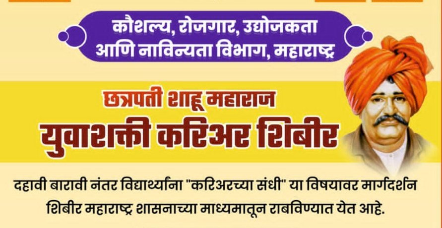कुशल महाराष्ट्र, रोजगारयुक्त महाराष्ट्र घडविण्याच्या उद्देशाने कौशल्य, रोजगार, उद्योजकता व नाविन्यता विभागांतर्गत व्यवसाय शिक्षण व प्रशिक्षण संचालनालयामार्फत विद्यार्थी, युवक-युवतींसाठी राज्यातील 36 जिल्ह्यांत जिल्हास्तरावर तसेच राज्यातील सर्व 288 मतदारसंघांत 6 मे ते 6 जून 2023 या कालावधीत छत्रपती शाहू महाराज युवाशक्ती करिअर शिबिरांचे आयोजन करण्यात आले आहे. नवीन शैक्षणिक वर्ष आता सुरु होत असून त्या पार्श्वभूमीवर