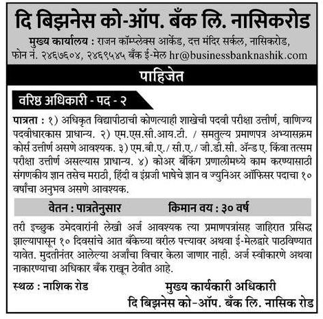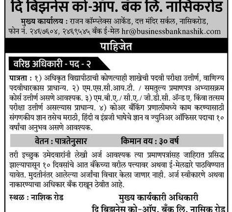 बिझिनेस को ऑपरेटिव्ह बँक नाशिक येथे भरती