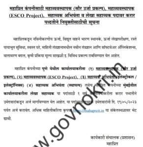 पदाचे नाव- महाव्यवस्थापक (सौर प्रकल्प), महाव्यवस्थापक (ESCO प्रकल्प), सहाय्यक अभियंता (इलेक्ट्रिकल/इलेक्ट्रॉनिक्स), सहाय्यक अभियंता (स्थापत्य), आणि लेखा सहाय्यक