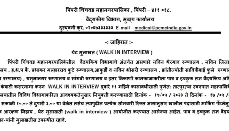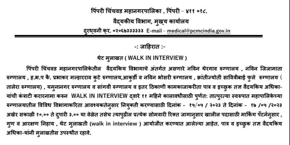 मुलाखतीचा पत्ता- वैद्यकीय विभाग प्रमुख यांचे कार्यालय, पिंपरी चिंचवड महानगरपालिका, दुसरा मजला, वैद्यकीय विभाग मुख्य कार्यालय, पिंपरी-18