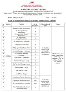 मुलाखतीचा पत्ता- प्रभारी, एचआर विभाग AI एअरपोर्ट सर्व्हिसेस लिमिटेड (पूर्वी AIR INDIA AIR TRANSPORT SERVICES LTD म्हणून ओळखले जाणारे.) CSMI विमानतळ, सहार, मुंबई 400099.