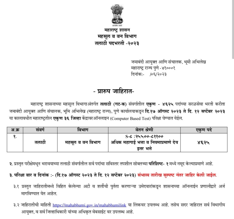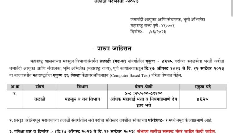 महाराष्ट्र शासनाच्या महसूल विभागाअंतर्गत तलाठी (गट- क) संवर्गातील एकुण- ४६२५ पदांच्या सरळसेवा भरती करीता जमाबंदी आयुक्त आणि संचालक, भूमि अभिलेख (महाराष्ट्र राज्य), पुणे कार्यालयाकडून दि. १७ ऑगस्ट २०२३ ते दि. १२ सप्टेंबर २०२३ या कालावधीत महाराष्ट्रतील एकुण ३६ जिल्हा केंद्रावर ऑनलाइन परिक्षा घेण्यात येईल.