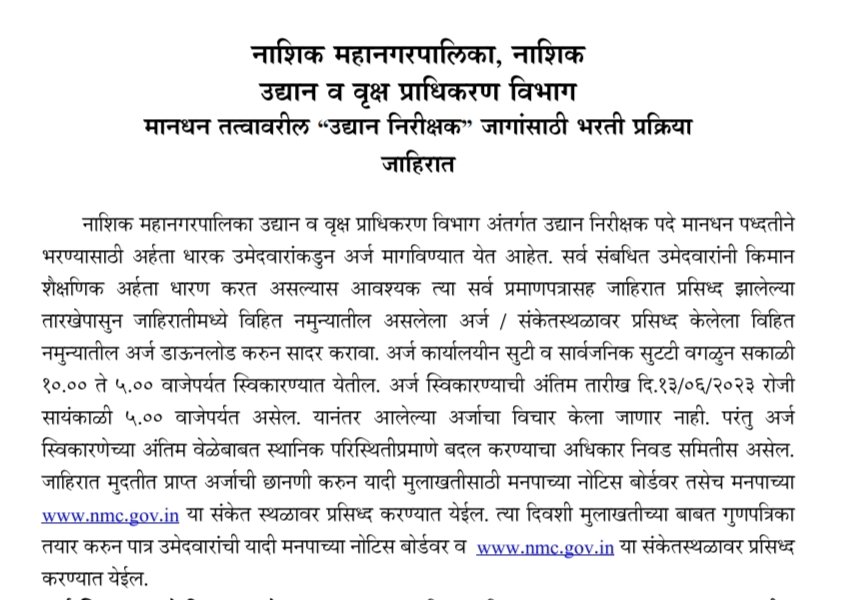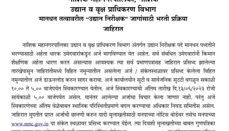 नाशिक महानगरपालिकेत उद्यान निरीक्षक पदासाठी थेट मुलाखतीद्वारे भरती
