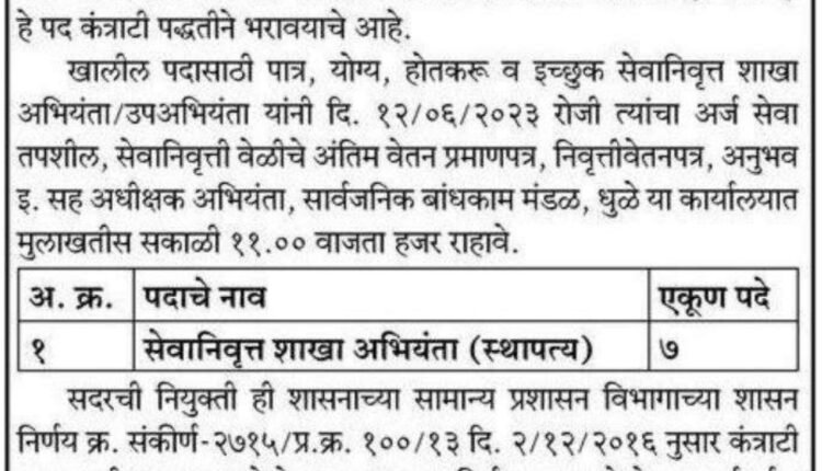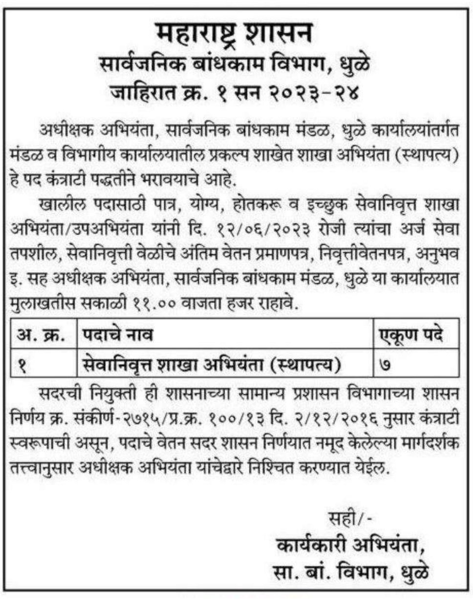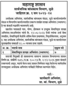 महाराष्ट्र सार्वजनिक बांधकाम विभाग, धुळे येथे भरती