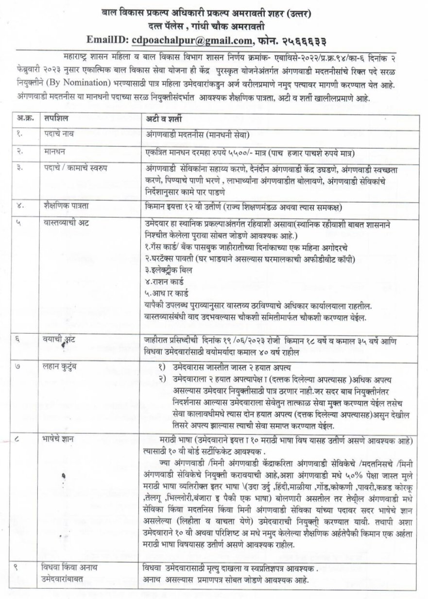 एकात्मिक बाल विकास अंतर्गत अंगणवाडी मदतनीस पदांची अमरावती येथे भरती