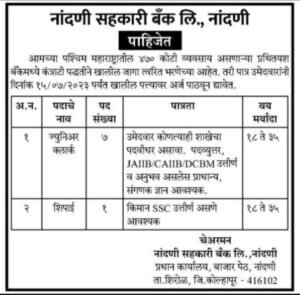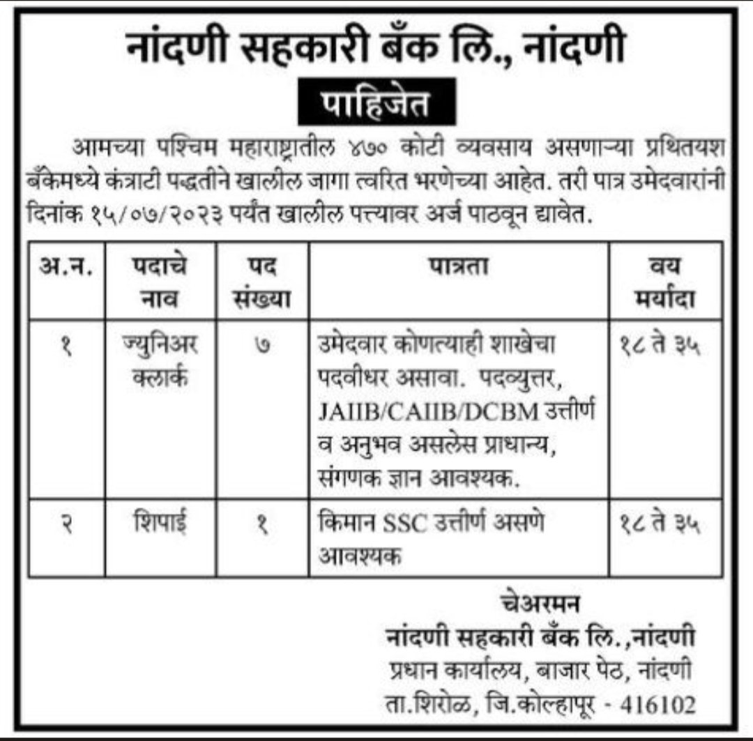 अर्ज करण्याचा पत्ता- नांदणी सहकारी बँक लिमिटेड, 1224, बाजार पेठ, पोस्ट: नांदणी, तालुका: शिरोळ, जिल्हा: कोल्हापूर. पिन कोड: 416102