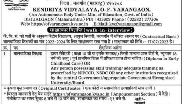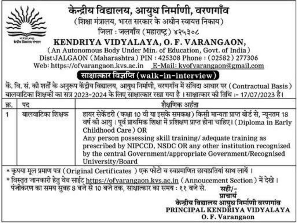 केंद्रीय विद्यालय वरणगाव येथे थेट मुलाखतीद्वारे भरती