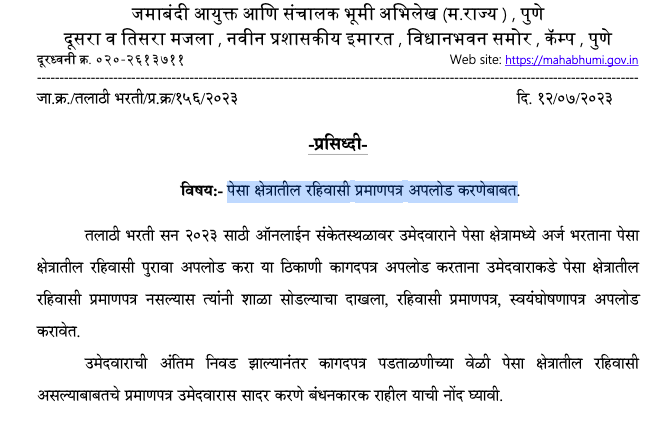 तलाठी भरती सन २०२३ साठी ऑनलाईन संकेतस्थळावर उमेदवाराने पेसा क्षेत्रामध्ये अर्ज भरताना पेसा क्षेत्रातील रहिवासी पुरावा अपलोड करा या ठिकाणी कागदपत्र अपलोड करताना उमेदवाराकडे पेसा क्षेत्रातील रहिवासी प्रमाणपत्र नसल्यास त्यांनी शाळा सोडल्याचा दाखला, रहिवासी प्रमाणपत्र, स्वयंघोषणापत्र अपलोड करावेत.