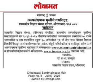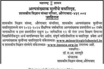शासकीय विज्ञान संस्था, औरंगाबाद संचलित, शासकीय अल्पसंख्याक मुलींच्या वसतिगृहामध्ये सन २०२३ २०२४ शैक्षणिक वर्षाकरिता अल्पसंख्याक प्रवर्गातील ७० टक्के जागाकरिता व इतर प्रवर्गातील एकूण ३० जागेकरिता १२ वी नंतर उच्च शिक्षण घेणाऱ्या विद्यार्थिनीकडून अर्ज मागविण्यात येत आहेत.