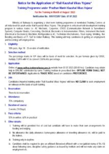 पात्रता:- 1) हायस्कूल उत्तीर्ण, 2) वय 18-35 वर्षे, 3) अर्जाची तारीख 07.07.2023 00:00 तास) ते 20.07.2023 (23:59 तास) | प्रशिक्षणासाठी अर्ज फक्त ऑनलाइन केला जाईल. इच्छुक उमेदवार प्रशिक्षणासाठी अर्ज करू शकतात आणि तपशीलवार माहितीसाठी