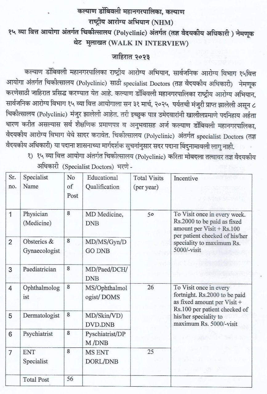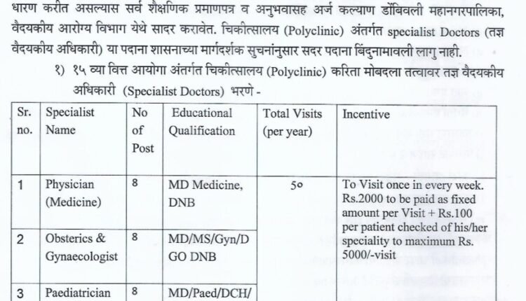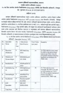 पदाचे नाव- फिजिशियन, प्रसूती आणि स्त्रीरोग तज्ञ, बालरोगतज्ञ, नेत्ररोग तज्ञ, त्वचारोग तज्ञ, मानसोपचार तज्ञ, ईएनटी तज्ञ