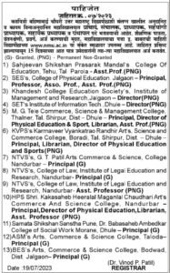 पदाचे नाव- प्राचार्य, संचालक, प्राध्यापक, सहयोगी प्राध्यापक, सहायक प्राध्यापक आणि ग्रंथपाल