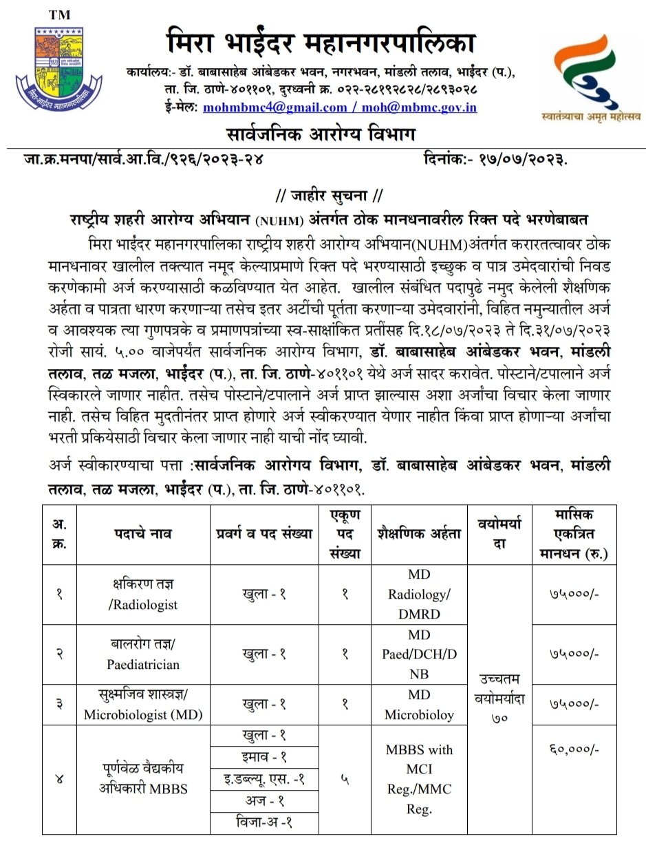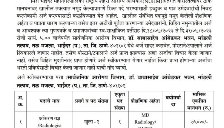 अर्ज करण्याचा पत्ता- आरोग्य विभाग, डॉ.बाबासाहेब आंबेडकर भवन, मांडली तलाव, तळमजला भाईंदर (प.), जि. ठाणे-401101