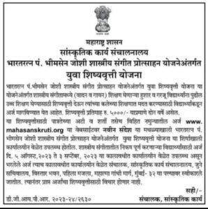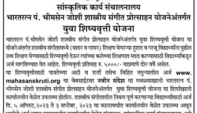 भारतरत्न पं. भीमसेन जोशी शास्त्रीय संगीत प्रोत्साहन योजनेअंतर्गत युवा शिष्यवृत्ती योजना या योजने अंतर्गत शास्त्रीय संगीतामध्ये (वादन व गायन) शिक्षण घेणाऱ्या हुशार व गरजू विद्यार्थ्यांना पुढील उच्च शिक्षण घेण्यासाठी शिष्यवृत्ती देऊन त्यांच्या कलेच्या शिक्षणात मदत करण्यासाठी विद्यार्थ्यांकडून अर्ज मागविण्यात येत आहेत.