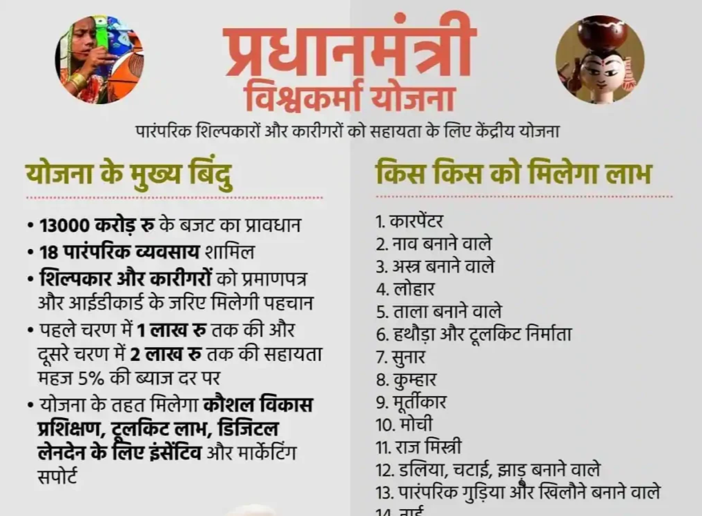 १८ प्रकारच्या पारंपरिक कारागिरांना व्यवसायासाठी आर्थिक मदत व प्रोत्साहन देण्यास साठी केंद्र शासनाद्वारे ही योजना सुरु करण्यात आली आहे.