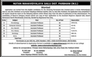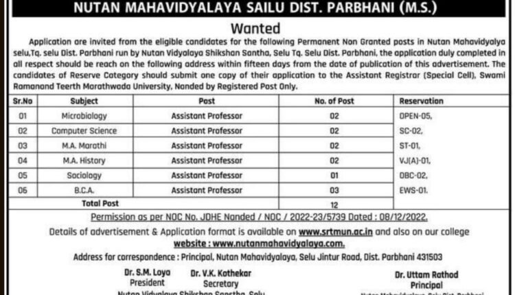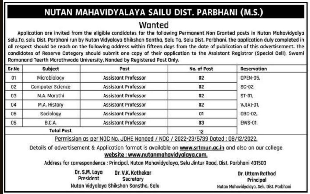 अर्ज करण्याचा पत्ता- प्राचार्य, नूतन महाविद्यालय, सेलू जिंतूर रोड, जि. परभणी-431503