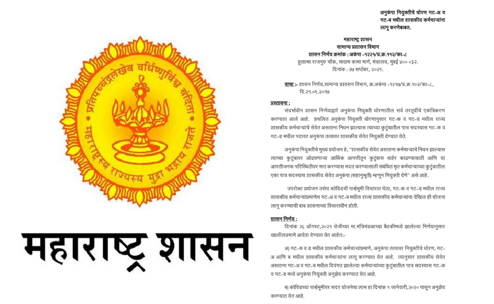 त्याच्या कुटुंबावर ओढवणाऱ्या आर्थिक आपत्तीतून कुटुंबास बाहेर काढण्यासाठी आणि या आपत्तीजनक परिस्थितीवर मात करण्यास मदत करण्यासाठी संबंधित मृत कर्मचाऱ्याच्या कुटुंबातील एका पात्र सदस्यास शासकीय सेवेत अनुकंपा (सहानुभूती) म्हणून नियुक्ती देणे” असे आहे. उपरोक्त प्रयोजन तसेच कोविडची पार्श्वभूमी विचारात घेता, गट-क व गट-ड मधील राज्य