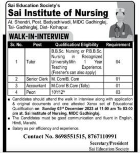 मुलाखतीचा पत्ता- साई इन्स्टिट्यूट ऑफ नर्सिंग, एमआयडीसी गडहिंग्लज, कोल्हापूर
