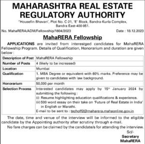 महाराष्ट्र स्थावर संपदा नियामक प्राधिकरणात भरती