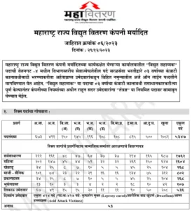 नोकरी विषयी महाराष्ट्र राज्य विद्युत वितरण कंपनीत मोठी भरती By Chetan Patil On Jan 3, 2024 0 Share पदाचे नाव- विद्युत सहाय्यक / विद्युत सहाय्यक पद संख्या- ५३४७ पदे शैक्षणिक पात्रता- 10+2 पास अर्ज करण्याची पद्धत- ऑनलाइन अर्ज करण्याची मुदत- 31 जानेवारी 2023 अधिकृत वेबसाईट- www.mahadiscom.in 0 Share FacebookTwitterGoogle+ReddItWhatsAppPinterestEmail