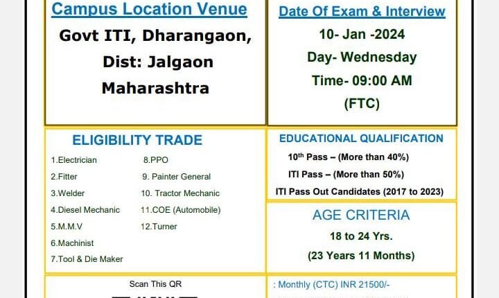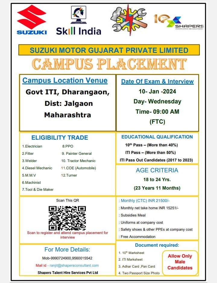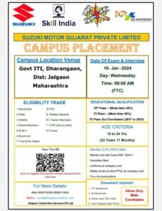 धरणगांव.जि.जळगाव येथे सुझुकी मोटार गुजरात प्रा.लि.व शा.औ.प्र.संस्था .धरणगांव कँम्पंस प्लेसमेंट आयोजित करीत आहे.