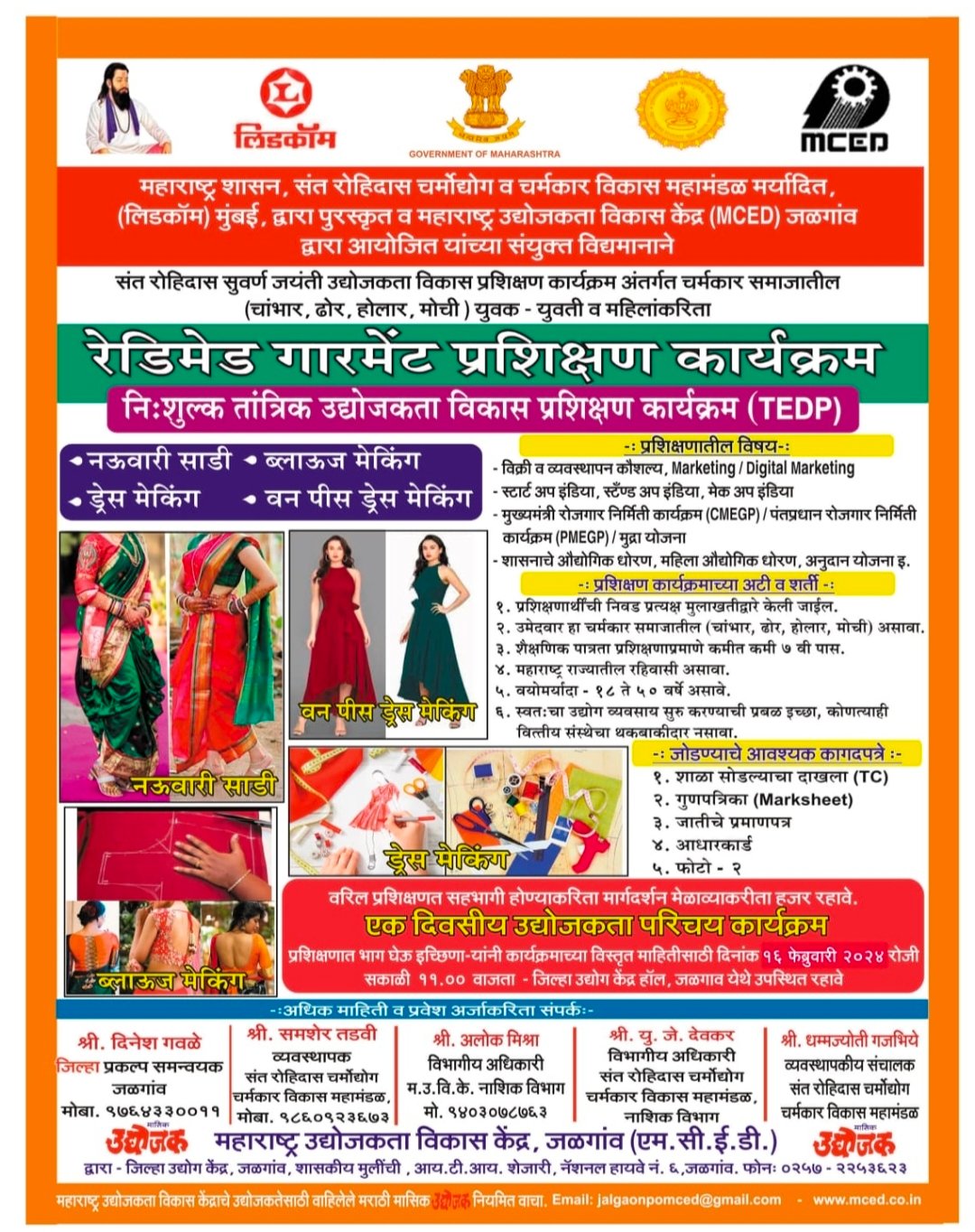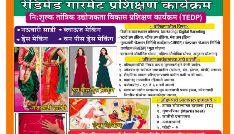 जळगाव येथे चर्मकार प्रवर्गातील (चांभार , होलार, मोची ढोर ) सुशिक्षित युवक युवती करिता मोफत रेडीमेड गारमेंट प्रशिक्षण कार्यक्रम प्रशिक्षणात नऊवारी साडी मेकिंग , ड्रेस मेकिंग ,ब्लाउज मेकिंग व वन पीस ड्रेस मेकिंग तयार करणे इत्यादी