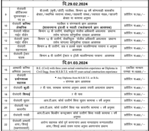 पदाचे नाव- कौशल्य विकास अधिकारी, तात्पुरते कनिष्ठ अभियंता (इलेक्ट्रिकल) अग्निसुरक्षा, अधिकारी, दैनिक वेतन सुरक्षा रक्षक, दैनंदिन वेतन तारलेखक, दैनंदिन वेतन पंप ऑपरेटर, चालक सहाय्यक, ग्रंथालय सहाय्यक, दैनिक फलोत्पादन पर्यवेक्षक, रोजंदारी वुमन नाईट वॉर्डन, दैनंदिन वेतन कनिष्ठ लेखापाल, दैनिक वेतन पुरुष नाईट वॉर्डन, चालक दैनिक ट्रॅक्टर चालक, अभियंता (स्थापत्य) दैनिक वेतन प्रयोगशाळा, सहाय्यक, दैनंदिन मजुरी पोर्टर, रोजंदारी रोजंदारी तात्पुरती उत्पन्न / शिपाई (पालक गृहासाठी)
