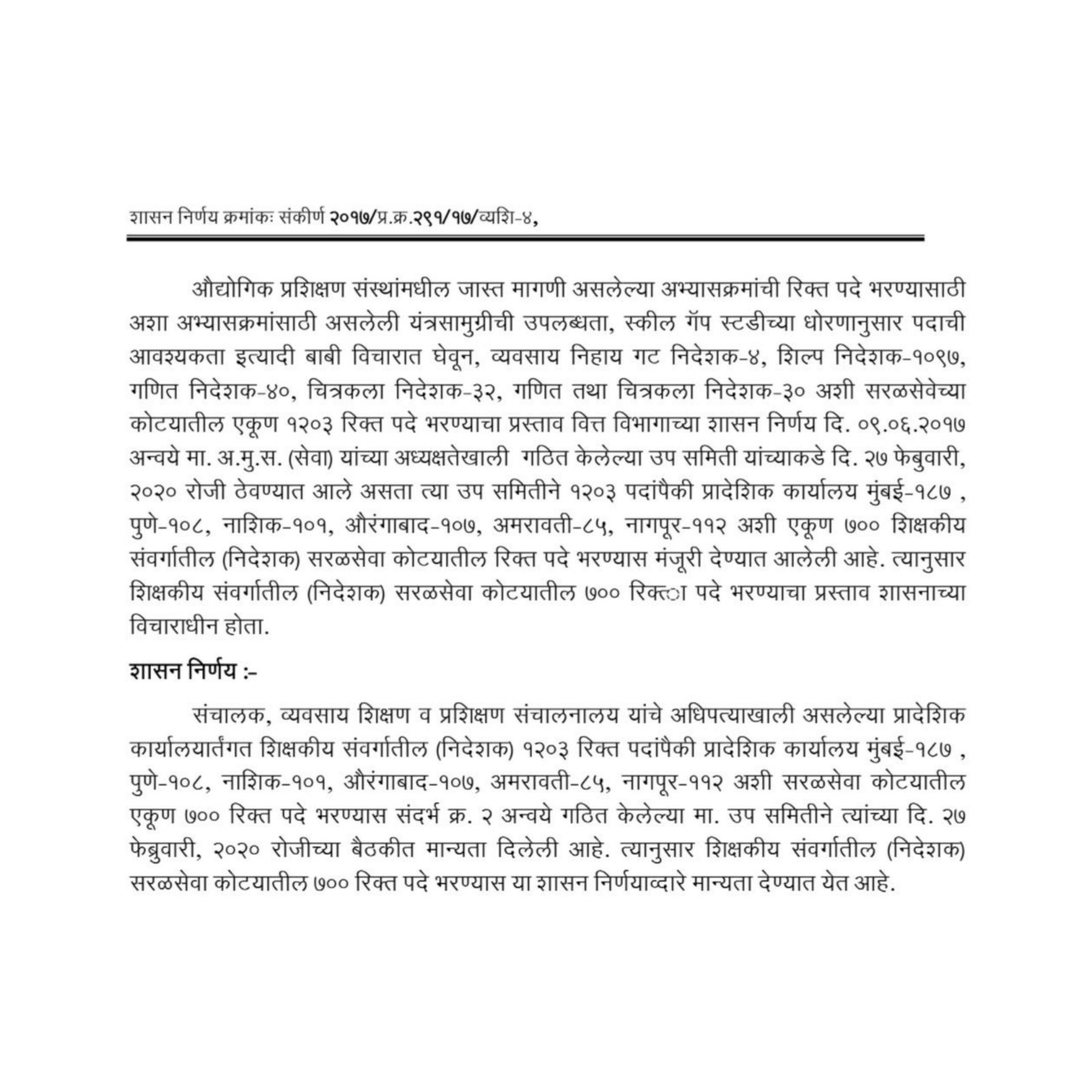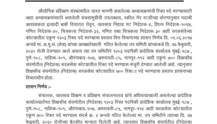व्यवसाय शिक्षण आणि प्रशिक्षण संचालनालयाच्या (डीव्हीईटी) अधिपत्याखालील प्रादेशिक कार्यालयाअंतर्गत शिक्षकीय संवर्गातील सातशे पदांची भरती करण्यास राज्य शासनाने मान्यता दिली आहे. पुणे, मुंबई, नाशिक, औरंगाबाद, अमरावती, नागपूर येथील एकूण सातशे पदे सरळसेवेद्वारे भरली जातील. कौशल्य विकास, रोजगार आणि उद्योजकता विभागाने या संदर्भातील शासन निर्णय प्रसिद्ध केला आहे. व्यवसाय शिक्षण आणि प्रशिक्षण संचालनालयाअंतर्गत राज्यात ७ हजार ३९६ नियमित शिक्षकीय पदे मंजूर आहेत. त्यापैकी २ हजार ३६३ पदे रिक्त आहेत. कंत्राटी तत्त्वावरील एक हजार ५०० पदांपैकी १ हजार ९०१ पदे रिक्त आहेत. औद्योगिक प्रशिक्षण संस्थांतील जास्त मागणी असलेल्या अभ्यासक्रमांची रिक्त पदे भरण्यासाठी संबंधित अभ्यासक्रमांसाठीची उपलब्ध यंत्रसामुग्री, स्कील गॅप धोरणानुसार पदाची आवश्यकता आदी बाबी विचारात घेऊन सरळसेवेच्या कोट्यातील १ हजार २०३ पदे भरण्याचा प्रस्ताव देण्यात आला होता. त्यातील शिक्षकीय संवर्गातील (निदेशक) सातशे पदांची सरळसेवा कोट्यातून भरती करण्यास शासन नियुक्ती उपसमितीने मान्यता दिल्याचे शासन निर्णयात स्पष्ट करण्यात आले आहे.