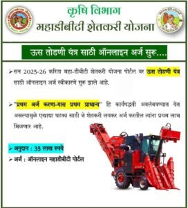 कृषी विभागाच्या योजना महाडीबीटी शेतकरी योजना पोर्टलवर ऊस तोडणी यंत्र साठी ऑनलाईन अर्ज स्वीकारणे सुरु… By Chetan Patil On Jul 27, 2025 0 Share 0 Share FacebookTwitterGoogle+ReddItWhatsAppPinterestEmail