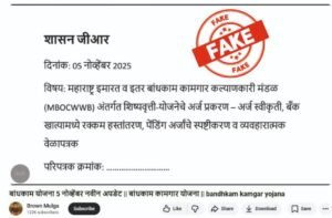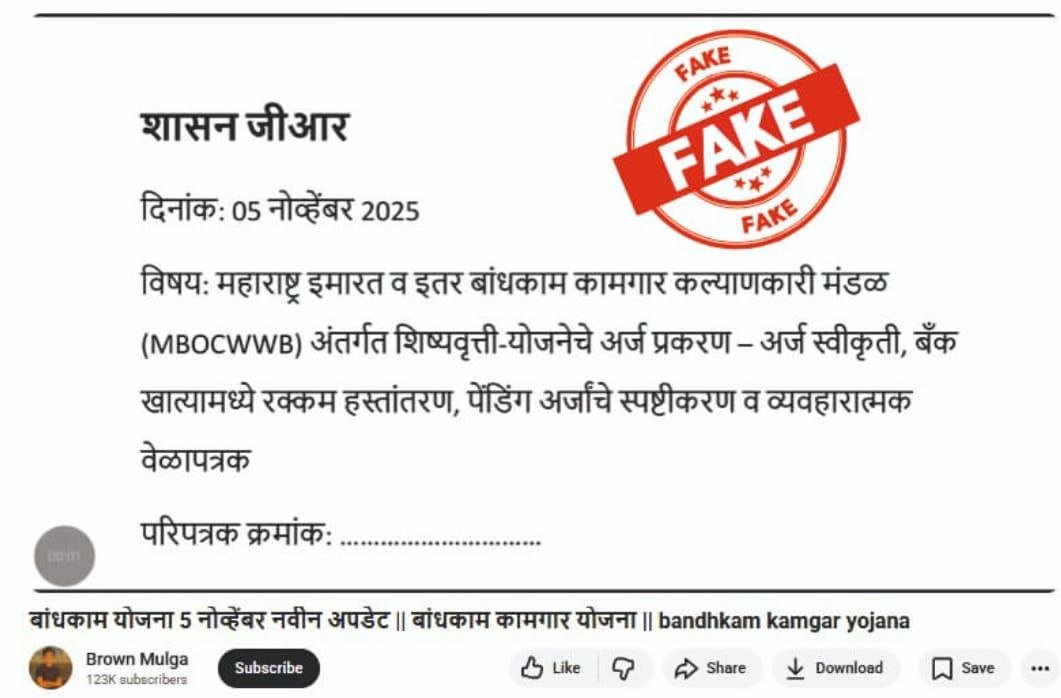 महाराष्ट्र इमारत व इतर बांधकाम कामगार कल्याणकारी मंडळांतर्गत “शिष्यवृत्ती योजनेचे अर्ज प्रकरण, अर्ज स्वीकृती, बँक खात्यामध्ये रक्कम हस्तांतरण” अशा आशयाची खोटी माहिती समाज माध्यमांद्वारे प्रसारित होत आहे.