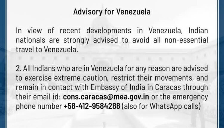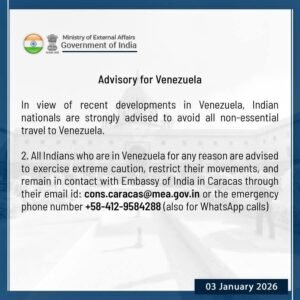 व्हेनेझुएलातील अलीकडील राजकीय आणि सामाजिक घडामोडींच्या पार्श्वभूमीवर भारत सरकारच्या परराष्ट्र व्यवहार मंत्रालयाने भारतीय नागरिकांसाठी महत्त्वाची सूचना (ट्रॅव्हल ॲडव्हायझरी) जारी केली आहे. व्हेनेझुएलातील सद्यस्थिती पाहता, भारतीय नागरिकांनी अत्यंत आवश्यक कामाशिवाय त्या देशाचा प्रवास करणे टाळावे, असे आवाहन केंद्र सरकारकडून अधिकृतपणे करण्यात आले आहे.