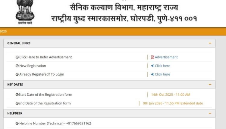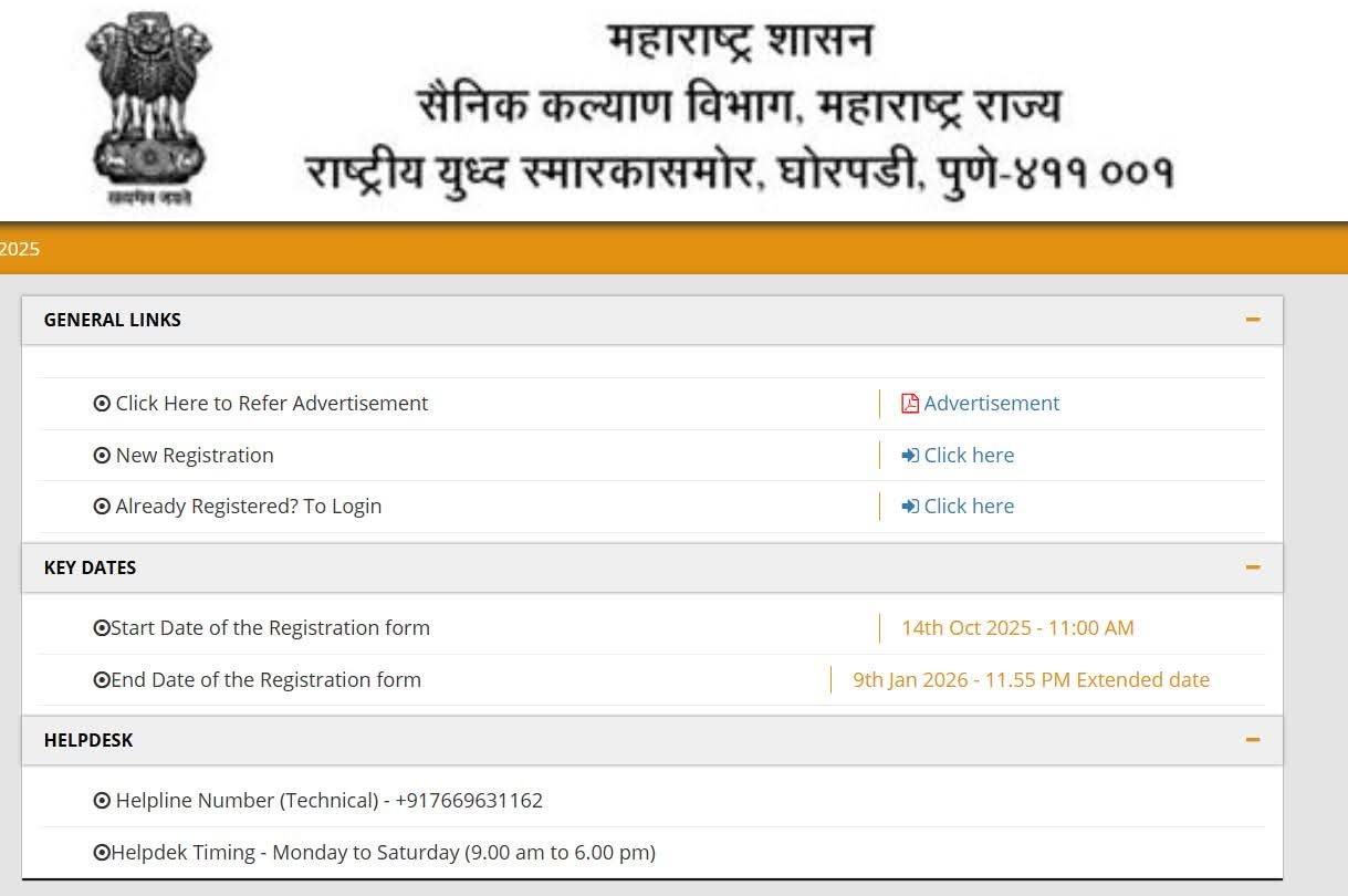 याबाबतची जाहिरात १२ ऑक्टोबर २०२५ रोजी, तर शुद्धिपत्रक ७ डिसेंबर २०२५ रोजी जारी करण्यात आले होते. तांत्रिक कारणास्तव सैनिक कल्याण विभागाचे संकेतस्थळ २६ डिसेंबर २०२५ पासून निष्क्रीय झाल्याने मुदतवाढ देण्यात आली आहे.