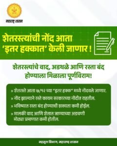 भारतीय कृषी समाजात शेती हा केवळ उपजीविकेचा नव्हे, तर एक जीवनशैलीचा अविभाज्य भाग मानला जातो. याच कृषी संस्कृतीच्या केंद्रस्थानी ‘शेतरस्ता’ हा विषय अत्यंत महत्वाचा असून, शेतीसाठी पोहोचाचा रस्ता असणे ही मूलभूत आवश्यकता आहे. मात्र गेल्या अनेक दशकांपासून पारंपरिक पायवाटा, बैलवाटी आणि नैसर्गिक रस्ते वापरले जात होते. परंतु, सध्याच्या यांत्रिकीकरणाच्या युगात हे मार्ग अपुरे पडत आहेत. अशा पार्श्वभूमीवर महाराष्ट्र शासनाने एक महत्त्वपूर्ण निर्णय घेतला आहे, जो शेतकऱ्यांसाठी वरदान ठरू शकतो शेतरस्त्यांची अधिकृत नोंद-7/12 उताऱ्यावर इतर हक्कांत करण्यात येणार आहे.