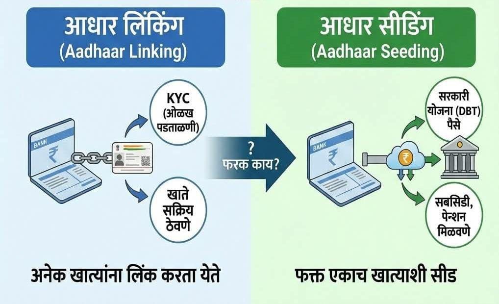 थोडक्यात: लिंकिंग म्हणजे ओळख पडताळणीसाठी आधार जोडणे, तर सीडिंग म्हणजे शासकीय लाभ थेट खात्यात मिळण्यासाठी आधार सक्रिय करणे.