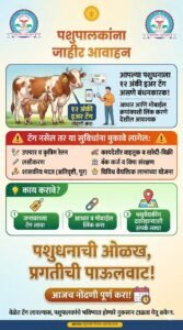 “पशुधनाची ओळख – प्रगतीची पाऊलवाट” या घोषवाक्याखाली राबविण्यात येणाऱ्या या मोहिमेत सर्व पशुपालकांनी सहभागी होऊन आजच नोंदणी पूर्ण करावी, असे आवाहन करण्यात आले आहे.