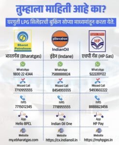 घरगुती LPG सिलेंडर बुकिंग आता अधिक सुलभ झाले असून, ग्राहकांना विविध डिजिटल माध्यमांद्वारे सहज बुकिंग करता येत आहे. भारत पेट्रोलियम (Bharatgas), इंडियन ऑइल (Indane) आणि हिंदुस्तान पेट्रोलियम (HP Gas) या तिन्ही प्रमुख कंपन्यांनी ग्राहकांसाठी WhatsApp, मिस्ड कॉल, IVRS, मोबाईल अॅप आणि अधिकृत वेबसाईटद्वारे बुकिंगची सुविधा उपलब्ध करून दिली आहे.. ‘HP Pay’ अॅप आणि https://myhpgas.in या वेबसाईटवरूनही बुकिंगची सोय आहे.